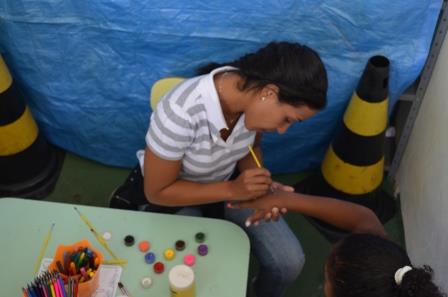 recebiam pinturas nos rostos, braços e mãos, com desenhos de coração, flores, bolas e carrinhos.